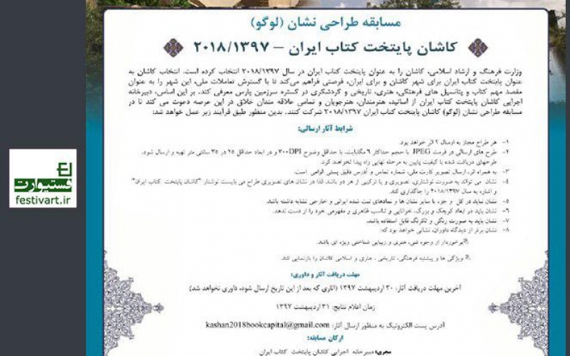به گزارش روابط عمومی سازمان فرهنگی ورزشی شهرداری کاشان، دبیرخانه اجرایی کاشان پایتخت کتاب ایران، مسابقه طراحی نشان (لوگو) کاشان پایتخت کتاب ایران ۱۳۹۷/۲۰۱۸ را به مناسبت انتخاب کاشان از سوی وزارت فرهنگ و ارشاد اسلامی به عنوان پایتخت کتاب ایران، برگزار میکند.